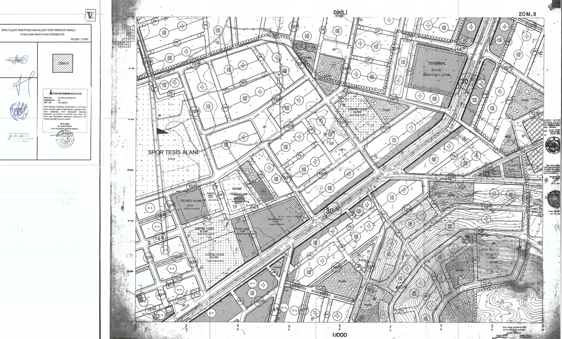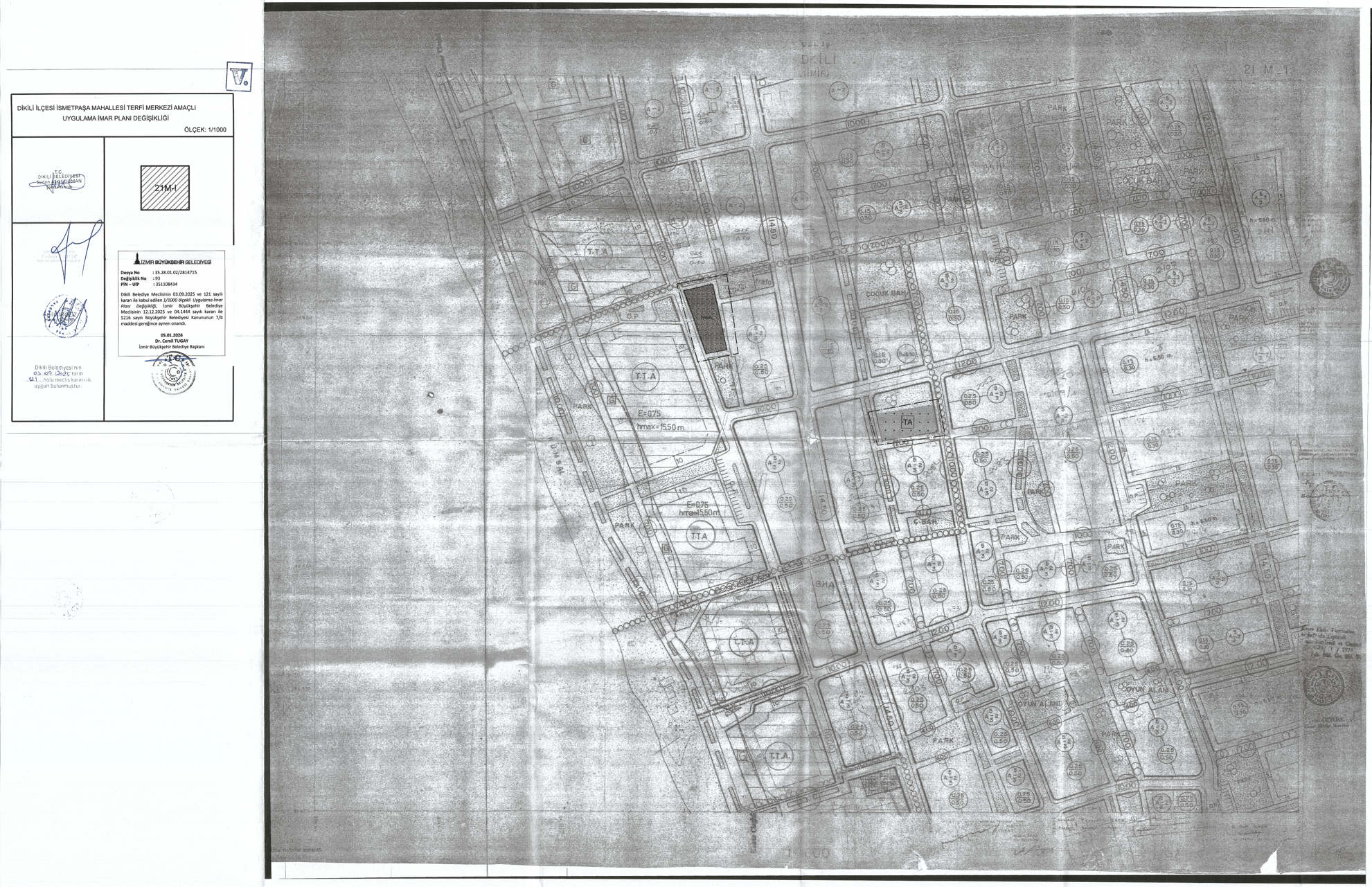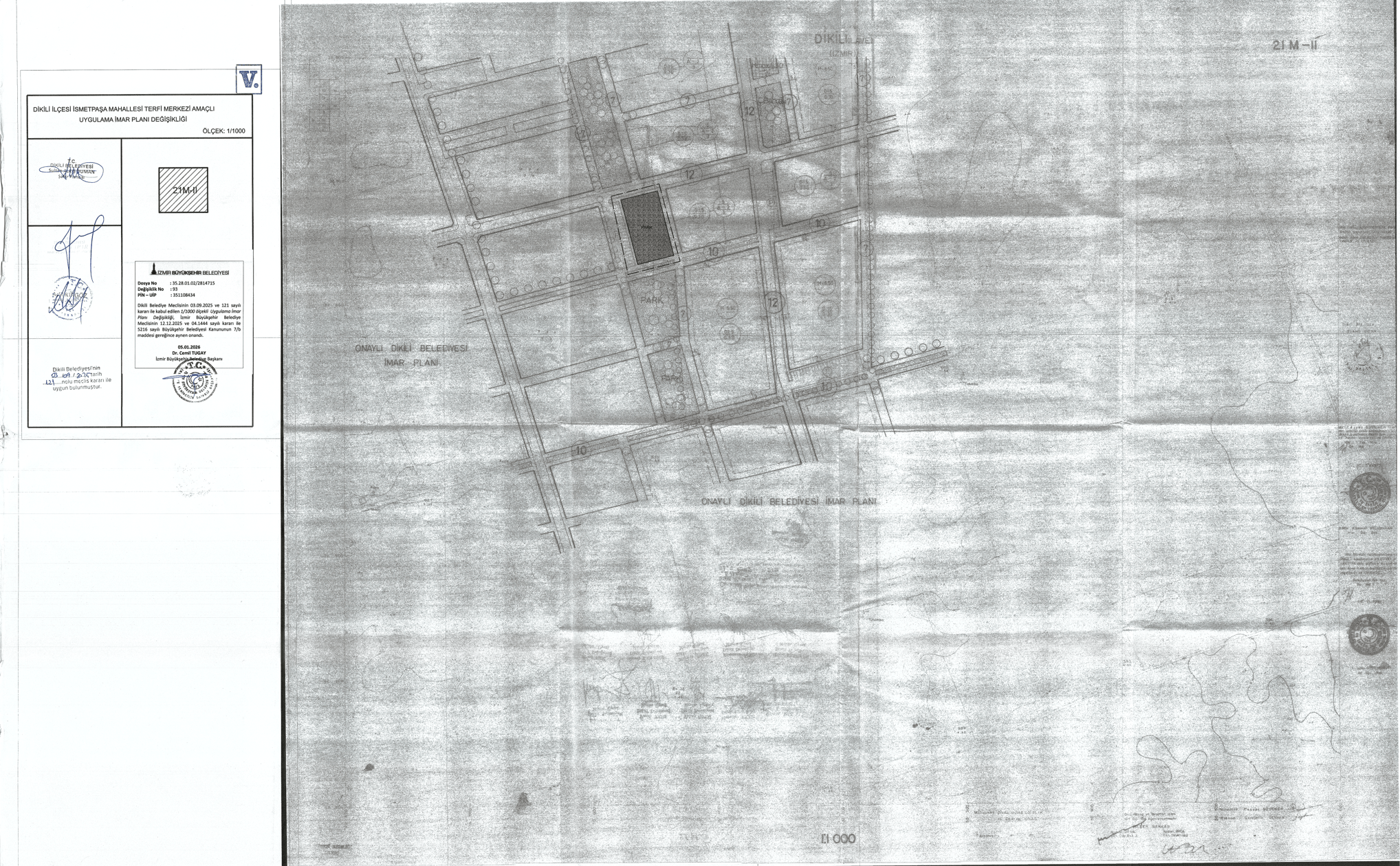 Dikili Belediye Meclisinin 03.09.2025 tarih ve 121 sayılı kararı ile onaylanan İsmetpaşa Mahallesi, 3 Adet Terfi Merkezi Amaçlı 1/1000 Ölçekli Uygulama İmar Planı Değişikliği, İzmir Büyükşehir Belediye Meclisinin 12.12.2025 tarih 04.1444 sayılı kararı ile uygun görülerek 5216 sayılı Büyükşehir Belediye Kanununun 7/b maddesi uyarınca onanmıştır.