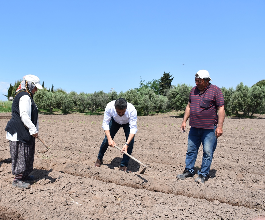 Dikili Belediye Başkanı Adil Kırgöz, çat kapı ziyaretleri kapsamında tarlada üreticiyle bir araya geldi.